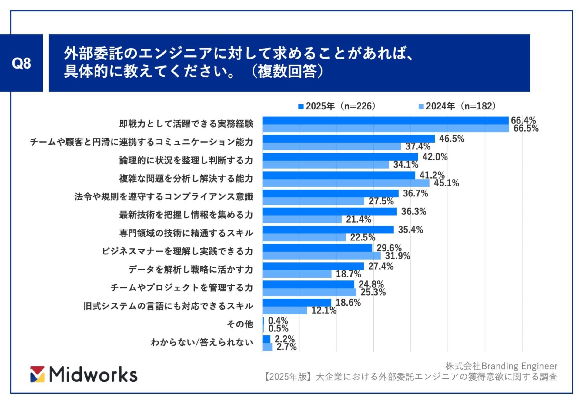 「Q8. Q1で「かなり意欲が高い」「やや意欲が高い」と回答した方にお聞きします。外部委託のエンジニアに対して求めることがあれば、具体的に教えてください。(複数回答)」(n=226)と質問したところ、「即戦力として活躍できる実務経験」が66.4%、「チームや顧客と円滑に連携するコミュニケーション能力」が46.5%、「論理的に状況を整理し判断する力」が42.0%という回答となりました。