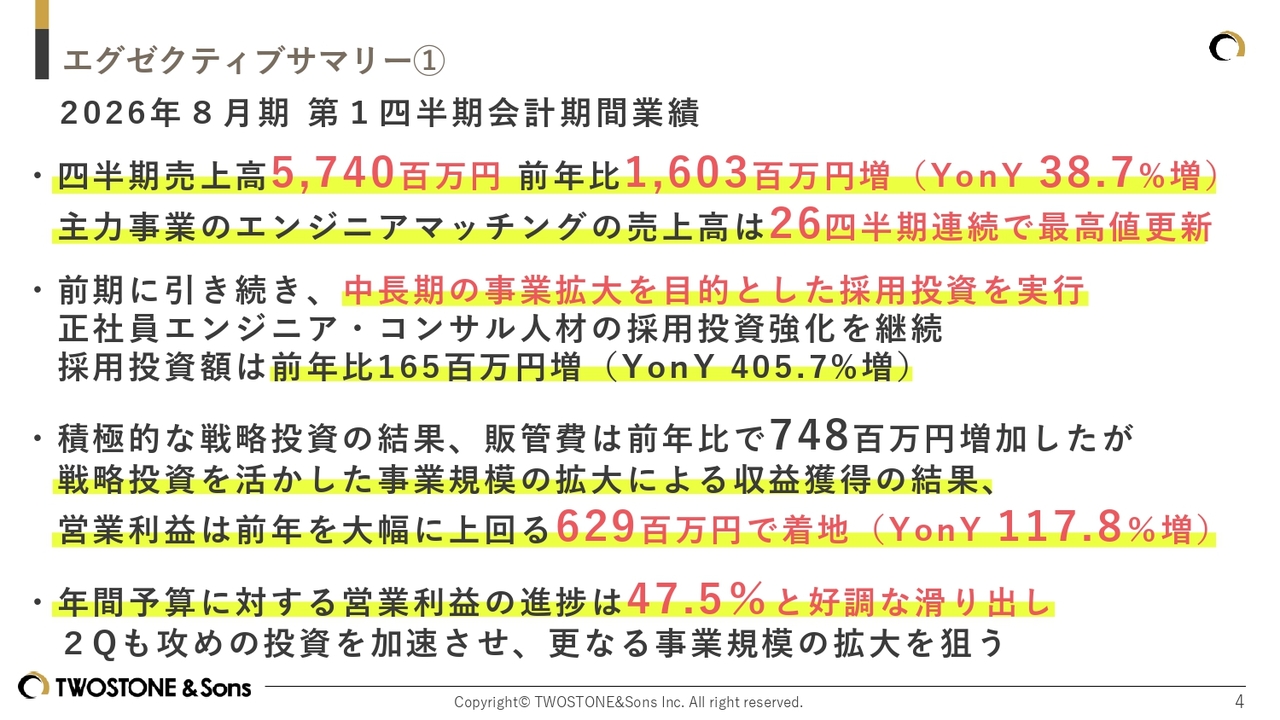 河端保志:株式会社TWOSTONE&Sons代表取締役CEOの河端保志です。本日はお忙しい中、決算説明会にご参加いただき、誠にありがとうございます。2026年8月期第1四半期の決算についてご説明します。