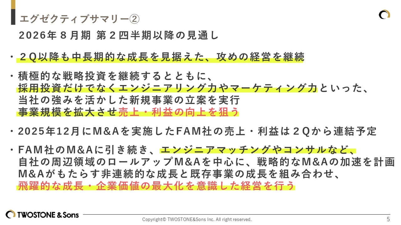 M&Aについては、2025年12月にFAM社のM&Aを実行しました。FAM社のPL連結は2026年8月期第2四半期からを予定しています。引き続き、自社の周辺領域におけるロールアップM&Aを中心に、戦略的なM&Aの加速を目指していきます。