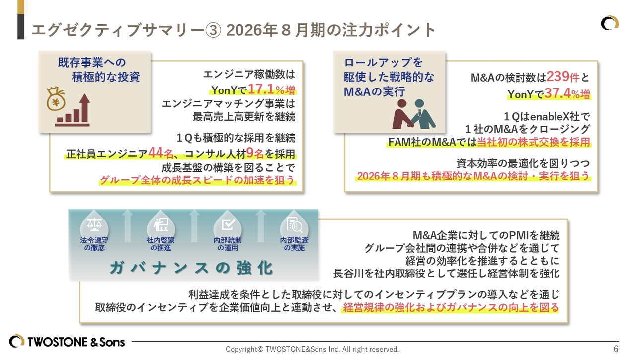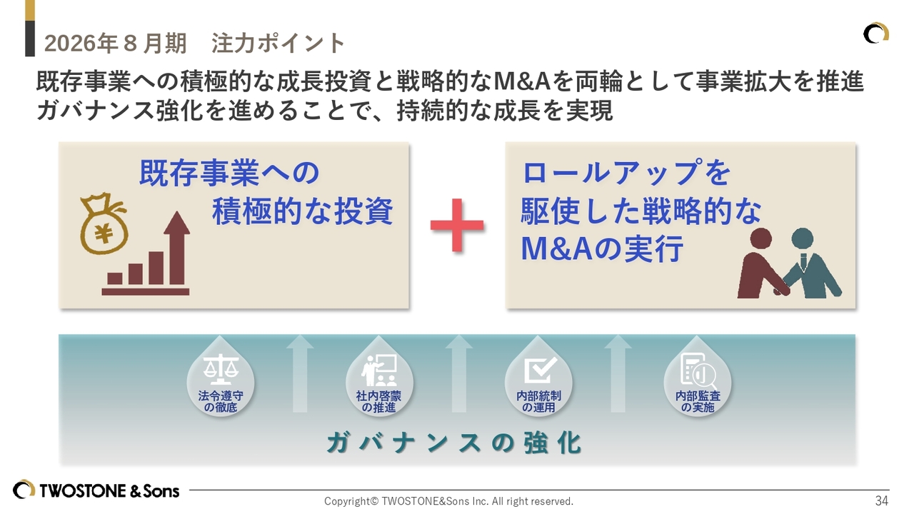 ここからは2026年8月期の方針についてご説明します。注力ポイントはスライドに掲げた3点です。「既存事業への積極的な成長投資」と「戦略的なM&A」を両輪として事業拡大を推進し「ガバナンス強化」を進めることで、持続的な成長を実現していきます。