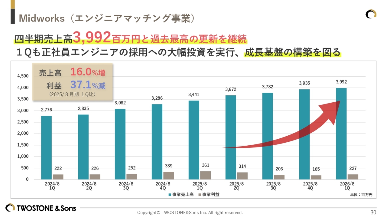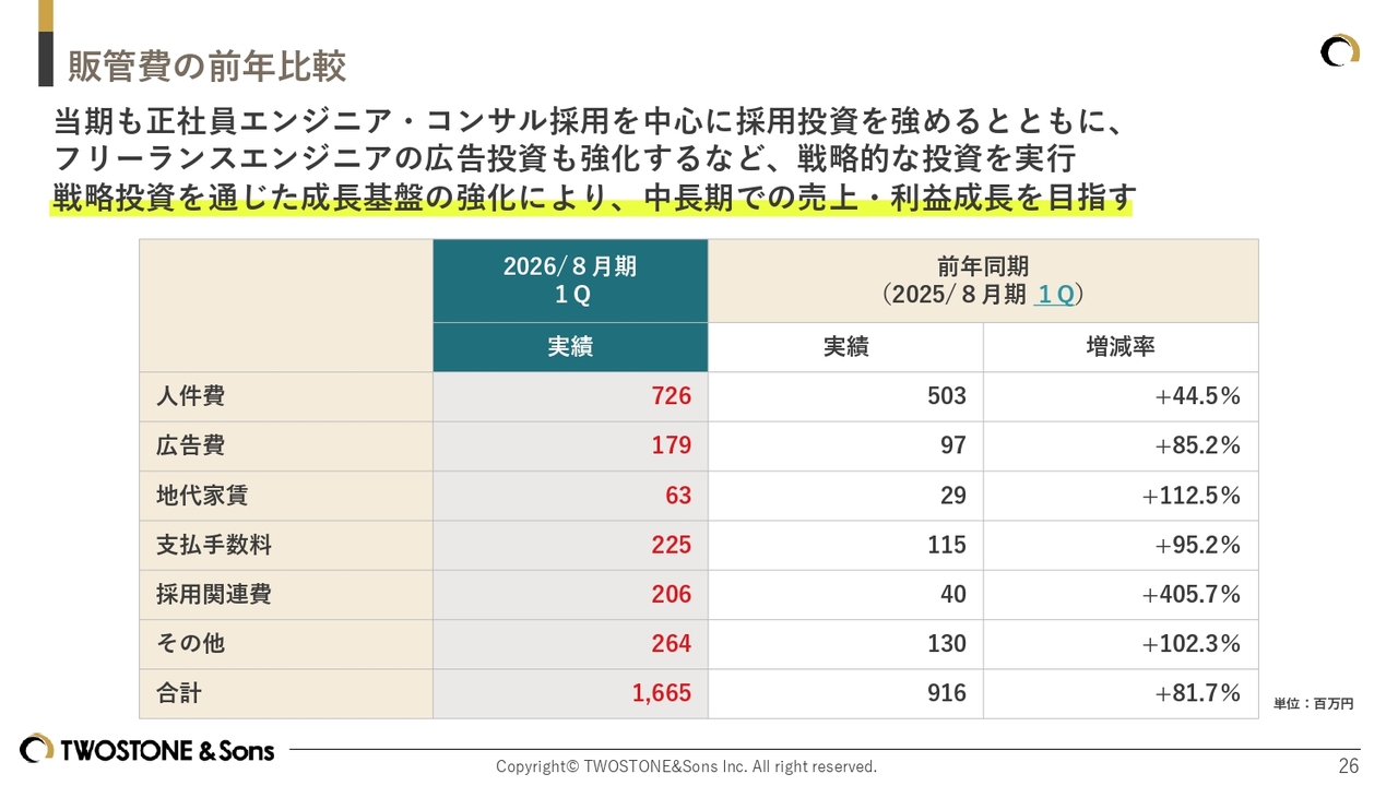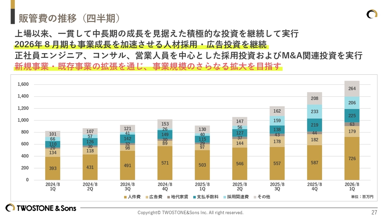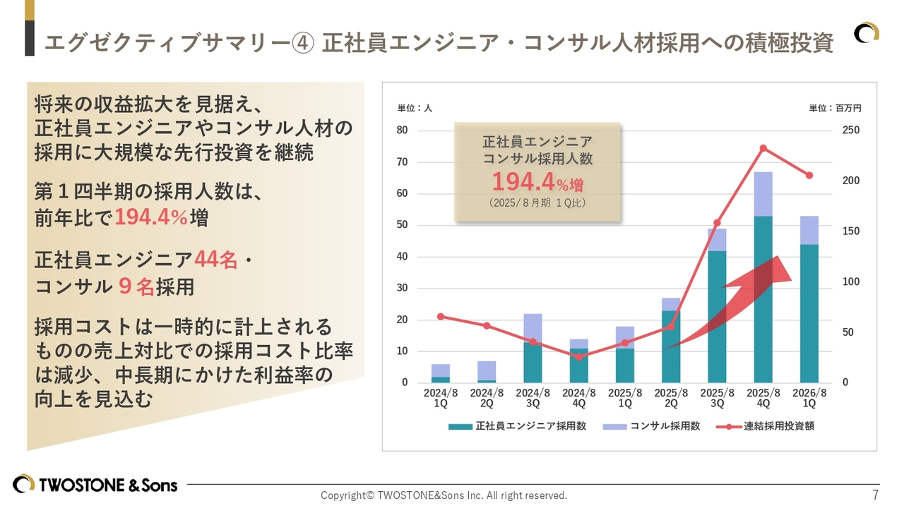 また、2025年8月期に引き続き、第1四半期も積極的な採用投資を行い、正社員エンジニアを44名、コンサル人材を9名採用しました。これにより、中長期の収益拡大に向けた成長基盤を構築できたと考えています。これらの人材を活用し、2026年8月期以降のグループ全体の成長スピードを加速させる原動力としたいと考えています。