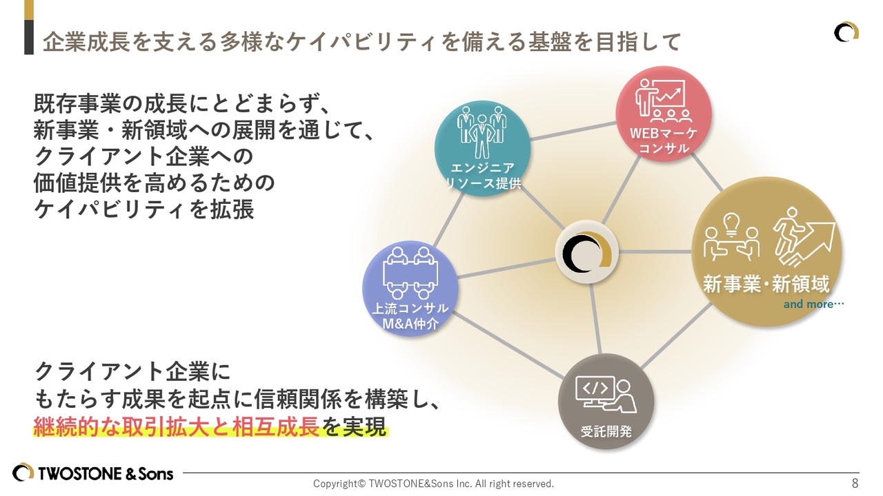 今後はこれらの既存事業の成長にとどまらず、新事業や新領域への進出を通じて、クライアント企業への価値提供を高めるためのケイパビリティを継続的に拡張していく方針です。