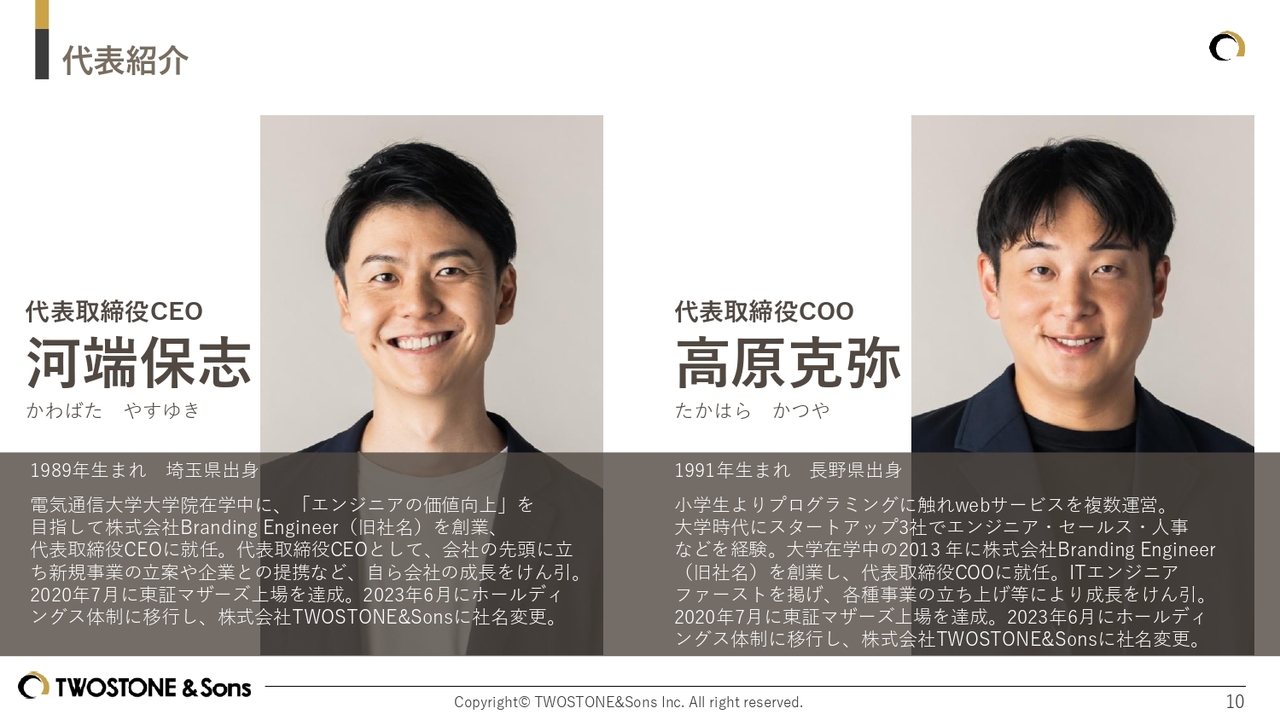あらためて自己紹介しますと、私は1989年、平成元年生まれの埼玉県出身です。大学院在学中に「エンジニアの価値向上」を目指し、当時大学生だった代表取締役COOの高原克弥と共同で、資本金10万円で創業しました。