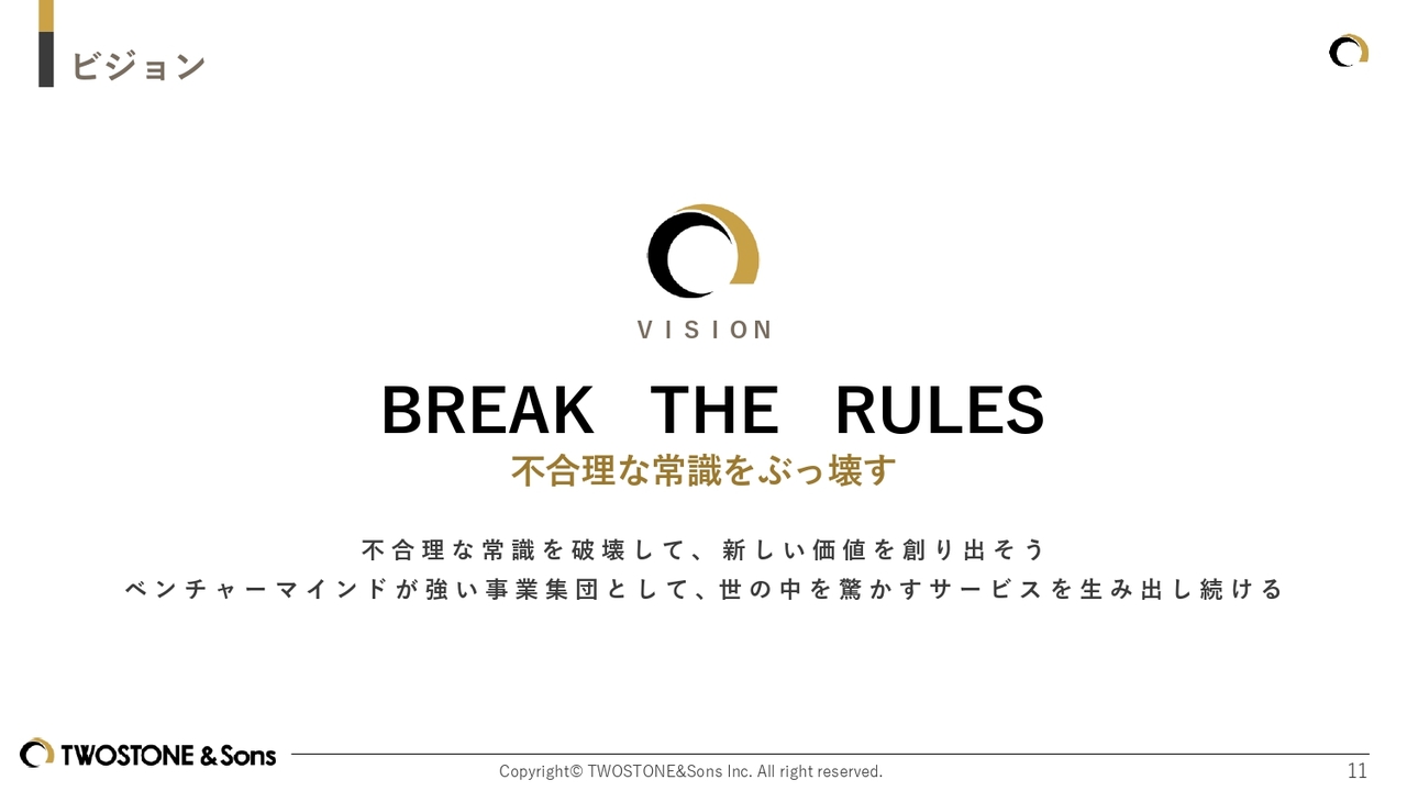 当社は、経営ビジョンとして「BREAK THE RULES」を掲げています。これは「不合理な常識をぶっ壊す」という意味を持ち、世の中に存在する不合理な常識を破壊し、新しい価値を創出する意志を表現しています。このような理念のもと、今はまだ常識とされていない新しい働き方に関する価値を提供し、世の中に貢献していきたいと考えています。