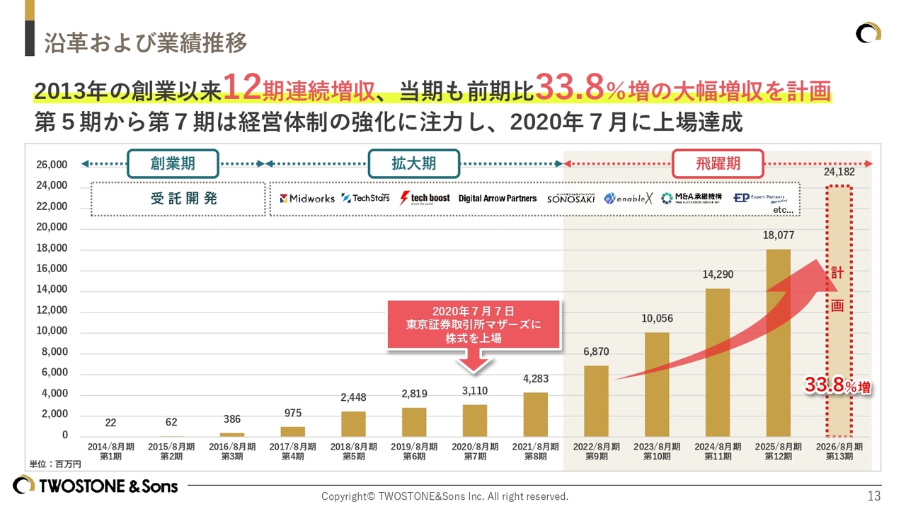 こちらのスライドは、これまでの業績推移です。当社は2013年の創業以来、2025年8月期で12期連続増収を達成しています。