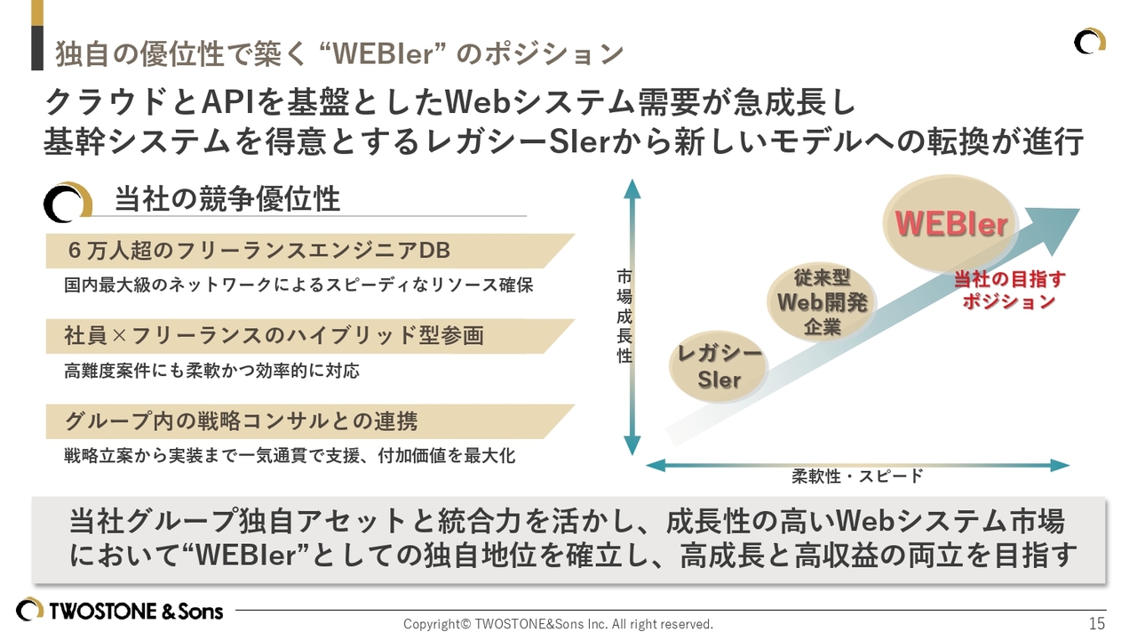 現在の市場をマクロ的に見ると、クラウドとAPIを基盤としたWebシステム需要が急成長しており、レガシーSIerから新しいモデルへの転換が進行していると考えられます。そのような市場の中で、当社グループ独自のアセットと総合力を活用し、成長性の高いWebシステム市場で“WEBIer”としての独自地位を確立し、高成長と高収益の両立を目指します。