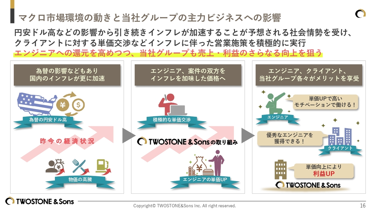マクロ市場環境の動きと当社グループの主力ビジネスへの影響についてご説明します。昨今の情勢を踏まえると、円安ドル高の影響もあり、今後もインフレの加速が予想されますが、当社のビジネスにとっては非常に追い風であると考えています。このような情勢下において、当社グループはクライアントに対する単価交渉など、インフレに対応した営業施策を積極的に実行していきます。
