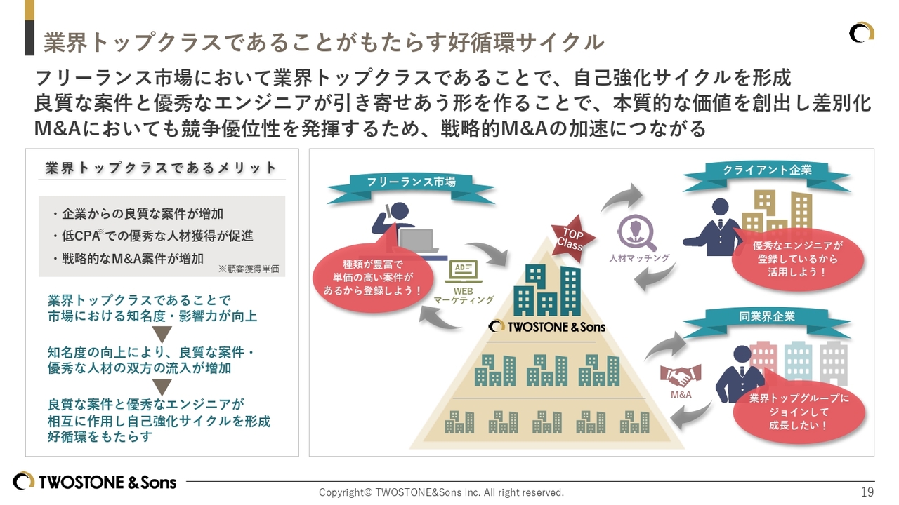 当社は優秀な人材や種類が豊富で単価の高い良質な企業案件を保有し、それらを効果的にマッチングできることが、本質的な価値であると考えています。これがトップクラスの地位を維持する上で非常に重要な好循環サイクルにつながっています。