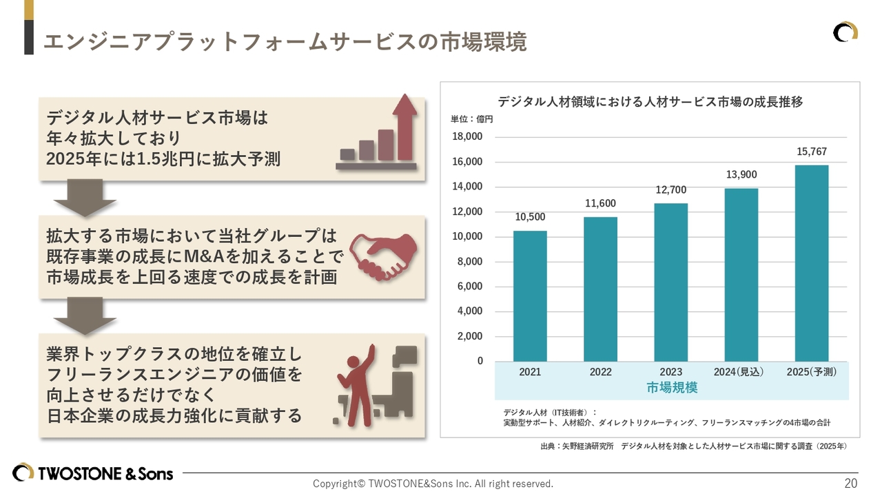 エンジニアプラットフォームサービスの市場動向についてご説明します。矢野経済研究所の調査によると、デジタル人材サービス市場は年々拡大しており、2025年には1兆5,000億円に達するとの予測が示されていました。この拡大する市場において、当社は既存事業の継続的な成長に加えて、M&Aによる非連続的な成長を組み合わせることで、市場成長を上回る速度での成長を計画しています。