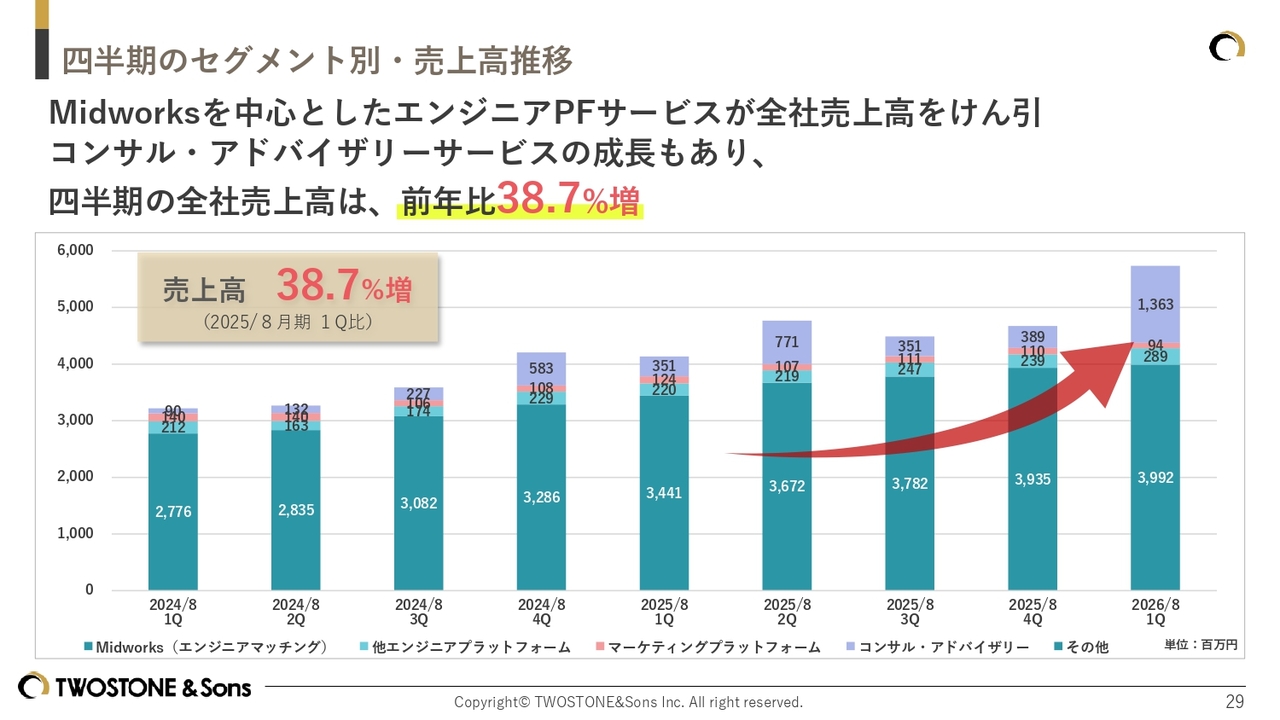 ここからはセグメントの業績についてご説明します。今回も「Midworks」を中心とするエンジニアプラットフォームサービスが全社売上高を牽引しました。また、コンサル・アドバイザリーサービスの成長もあり、四半期の全社売上高は前年同期比で38.7パーセント増となっています。