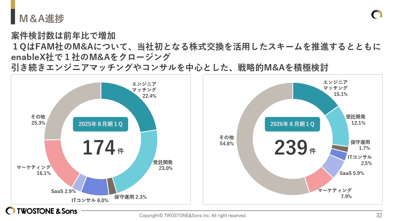 案件検討数も前年より増加しており、引き続きエンジニアマッチング領域やコンサルティング領域を中心に、戦略的なM&Aを積極的に進めていきます。