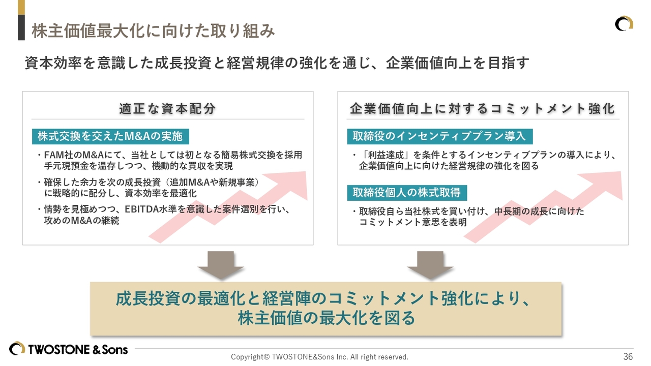 当社は、資本効率の向上および株主価値の最大化を強く意識した経営を進めていきます。その適切な資本配分の一例として、FAM社のM&Aにおいて株式交換を採用した点が挙げられます。現預金を温存しつつM&Aを推進することで、余剰資金を追加のM&Aや新規事業へと戦略的に配分し、さらなる成長を目指していきます。