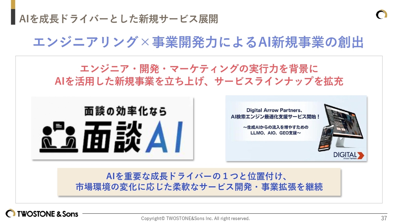 また、エンジニアや開発体制、Webマーケティングにおける実行力といった当社のアセットを背景に、AIを組み込んだサービスを立ち上げることでサービスラインナップの拡充を図り、持続的な成長につなげていきます。AIを成長ドライバーとして活用し、事業領域の拡張と企業価値の向上を目指します。