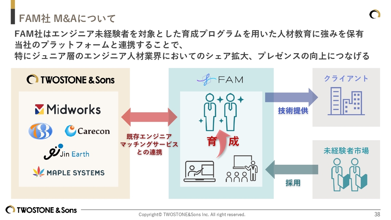FAM社のM&Aについてです。FAM社は、エンジニア未経験者を対象とした育成プログラムを用いた人材教育に強みを持っています。エンジニアプラットフォームとの連携により、特にジュニア層のエンジニア人材業界でのシェア拡大とプレゼンス向上につなげることができると考えています。