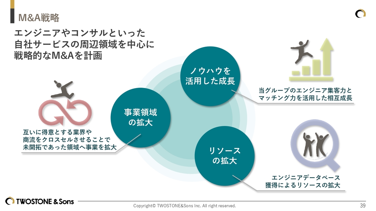 M&A戦略についてです。当社では、M&Aを飛躍的な成長を遂げるための重要な要素の1つと認識しています。そのため、今後もエンジニアプラットフォームサービスやコンサル・アドバイザリーサービスの周辺領域を中心に、戦略的なM&Aを実行していきたいと考えています。