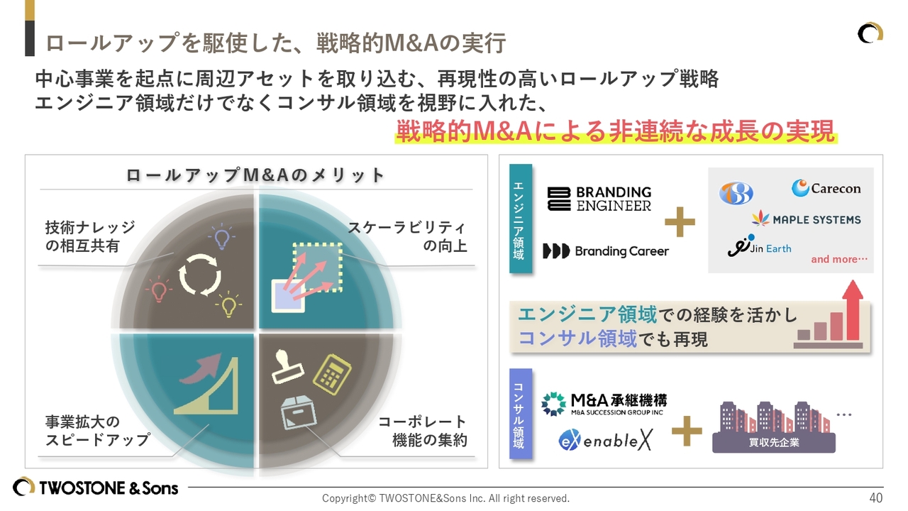 当社は、M&Aにおいて中心事業を起点に周辺アセットを取り込む、再現性の高いロールアップ戦略を採用しています。これまでは主にエンジニア領域で取り組んできましたが、この経験を活かし、今後はコンサル領域にも拡大していきたいと考えています。