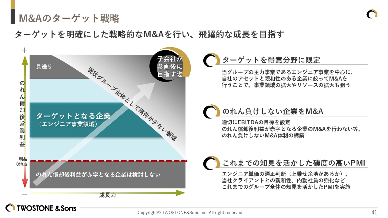 M&Aのターゲット戦略についてです。ターゲットを得意分野に限定すること、のれん負けしない企業をM&Aすること、これまでの知見を活かした確度の高いPMIを実行することを軸に、戦略的なM&Aを実行していきます。